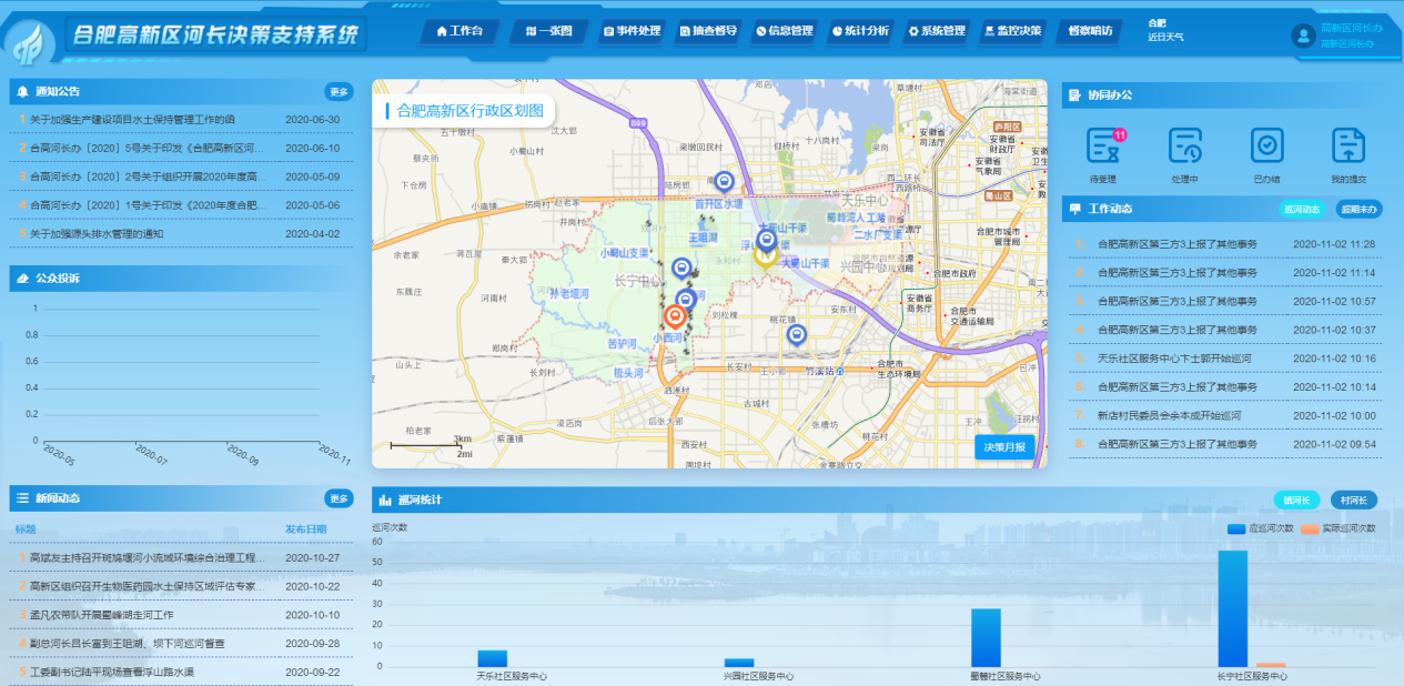 系統(tǒng)建成運(yùn)行5個(gè)月以來(lái),用戶體系覆蓋合肥市高新區(qū)各級(jí)河長(zhǎng)、成員單位、河道警長(zhǎng)100余人,巡河次數(shù)達(dá)8000余次,里程達(dá)1600多公里,巡河總時(shí)長(zhǎng)12000多分鐘,上報(bào)事件187件,事件辦結(jié)率80%以上,接入零直排監(jiān)控、水域岸線監(jiān)控和水質(zhì)斷面監(jiān)測(cè)站點(diǎn),獲取實(shí)時(shí)監(jiān)測(cè)數(shù)據(jù)約40000條。