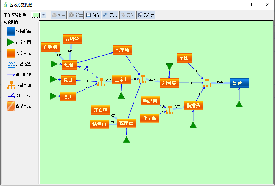 系統(tǒng)將集水區(qū)間、入流單元、預(yù)報斷面、虛擬斷面、河道等節(jié)點以不同的圖形概化成相應(yīng)的節(jié)點控件,通過拖拽各個節(jié)點控件,使用連接線可以構(gòu)造出流域中各節(jié)點間的關(guān)系,自動設(shè)置各節(jié)點的屬性選擇預(yù)報模型和河道匯流方式。