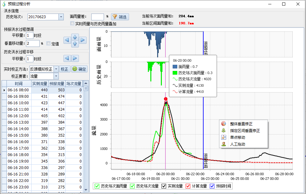 預(yù)報作業(yè)時系統(tǒng)能夠根據(jù)配置的預(yù)報方案快速計算出初步結(jié)果。同時,預(yù)報人員可參照歷史洪水、實時水雨情信息等,結(jié)合自身預(yù)報經(jīng)驗,對預(yù)報成果進行校正。