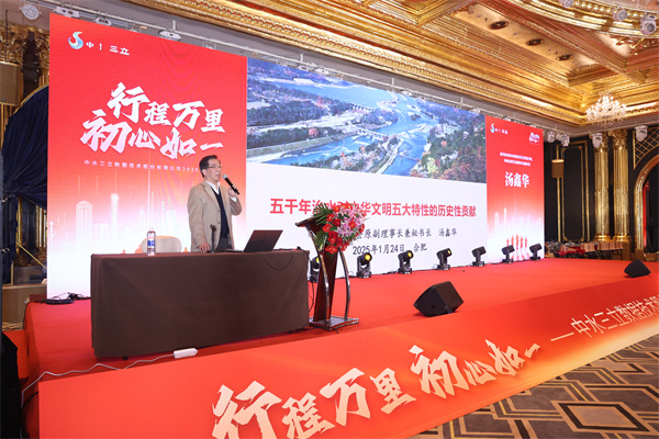 湯鑫華會長則以其淵博的歷史學(xué)識,帶來了《五千年治水對中華文明五大特性的歷史性貢獻》專題分享。他從宏大的歷史視角出發(fā),深刻揭示了治水活動在中華文明形成、發(fā)展及繁榮過程中的歷史性貢獻,展現(xiàn)了治水文化所蘊含的深厚智慧與不竭動力。湯會長的分享不僅激發(fā)了現(xiàn)場嘉賓對治水文化的深刻共鳴,更為中水三立人傳承和弘揚企業(yè)文化提供了寶貴的精神財富。