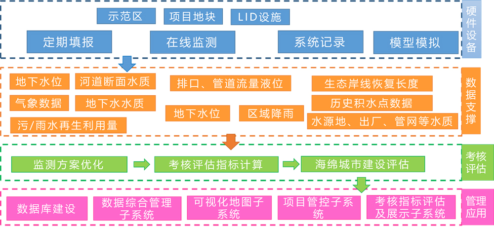 海綿城市一體化管控平臺(tái)是以實(shí)現(xiàn)對(duì)海綿城市建設(shè)、運(yùn)營(yíng)和管理的全過程信息化管理為目標(biāo),集海綿城市各階段信息的收集存儲(chǔ)與展現(xiàn)、海綿城市監(jiān)管業(yè)務(wù)的信息化處理、海綿城市的建設(shè)成效考核評(píng)估、海綿城市的宣傳與展示等業(yè)務(wù)需求為一體的綜合化信息平臺(tái)。