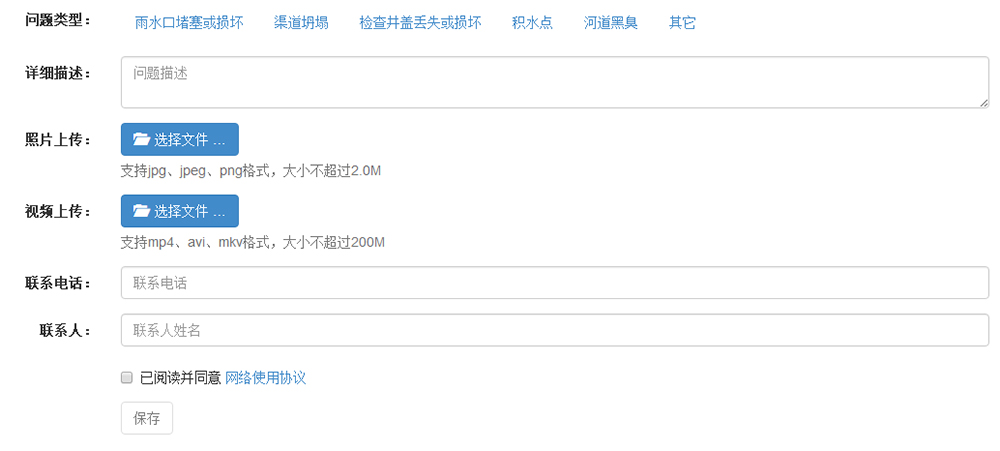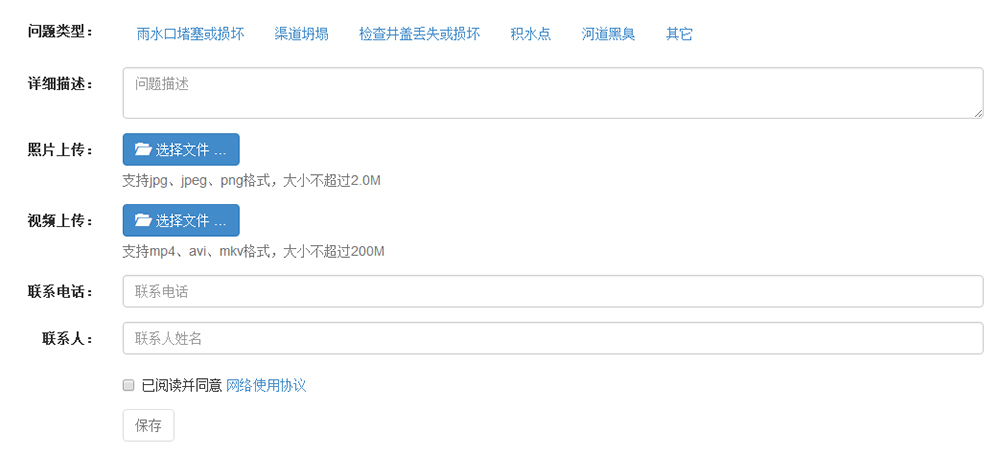 與公眾進(jìn)行信息交互的微信公眾號(hào)應(yīng)用,為民眾反饋雨水口堵塞或損壞、渠道坍塌、檢查井蓋丟失或損壞、積水點(diǎn)、河道黑臭等問題提供便捷的渠道。