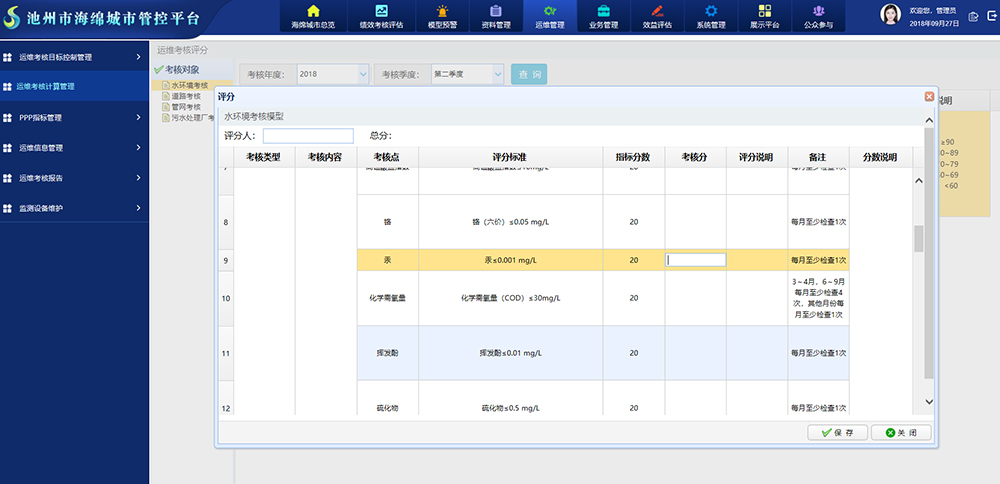 對(duì)各海綿城市PPP公司的運(yùn)維考核管控指標(biāo),結(jié)合在線監(jiān)測(cè)數(shù)據(jù)、運(yùn)維信息填報(bào)、現(xiàn)場(chǎng)抽查等數(shù)據(jù),實(shí)現(xiàn)對(duì)各PPP公司的項(xiàng)目運(yùn)維情況的信息化考核管理。